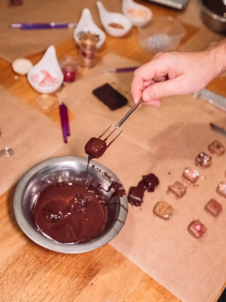 Ablauf: Einführung in die Pralinen- und Schokoladenherstellung, Temperieren, Überziehen, Dekorieren & Verpacken